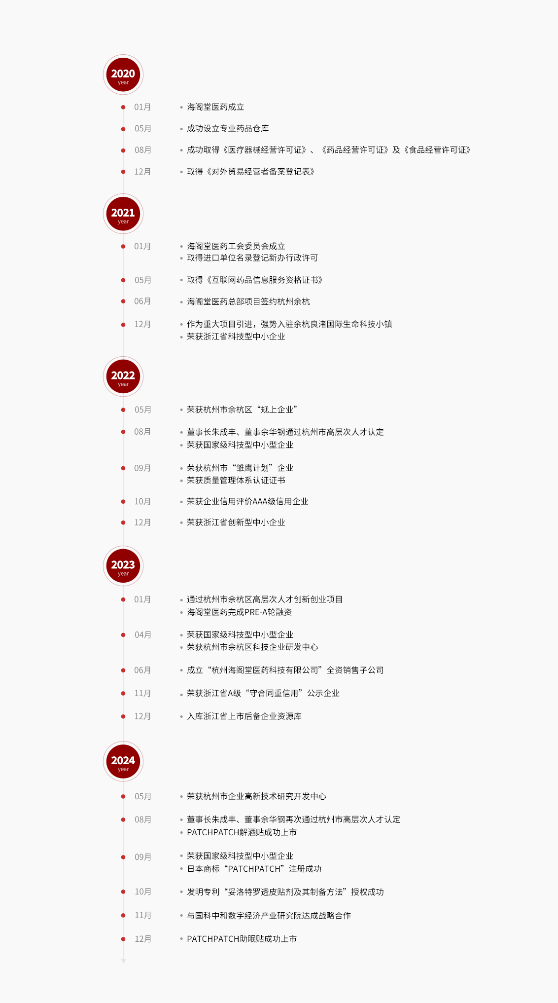 2021年作为重大项目引进,公司入驻余杭良渚国际生命科技小镇。目前,海阁堂医药已完成PRE-A轮融资,首款药品已进入临床后期即将提交药监审批,同时大健康系列产品在2024年陆续上市。